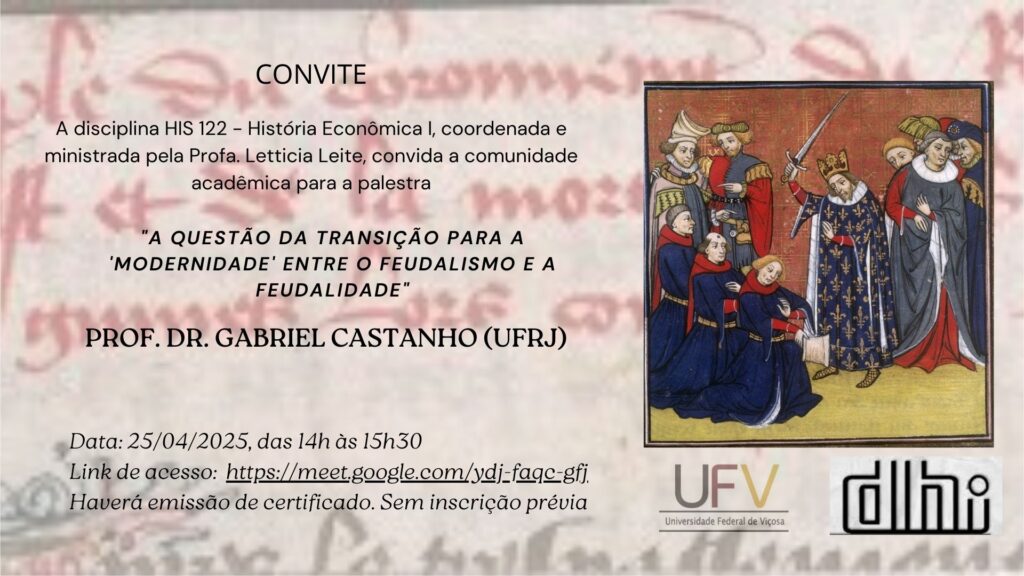A disciplina HIS 122 – História Econômica I, ministrada pela profª. Letticia Leite, convida toda a comunidade acadêmica para a palestra “A questão da transição para a ‘modernidade’ entre o feudalismo e a feudalidade”, que será ministrada pelo Professor Doutor Gabriel Castanho (UFRJ).